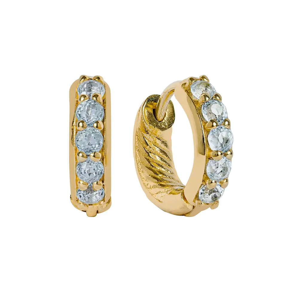 24ct gold plated on recycled brass and faceted Blue Topaz, Hinged huggie hoops, Hypo-allergenic and nickel free, Diameter: 1.3cm